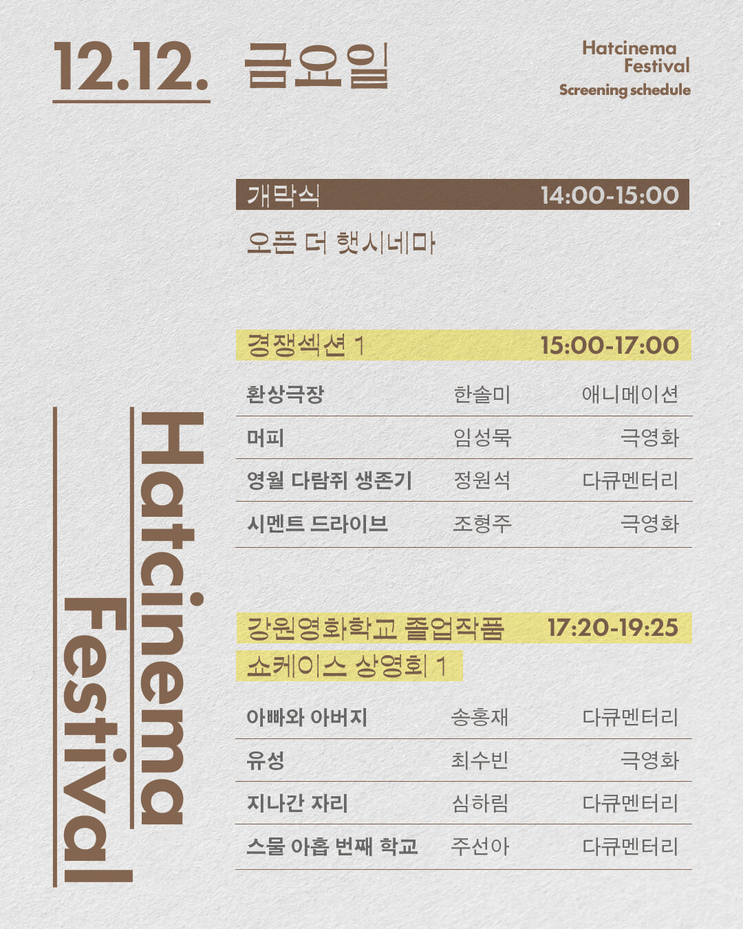 * 14:00 개막식: 오픈 더 햇시네마