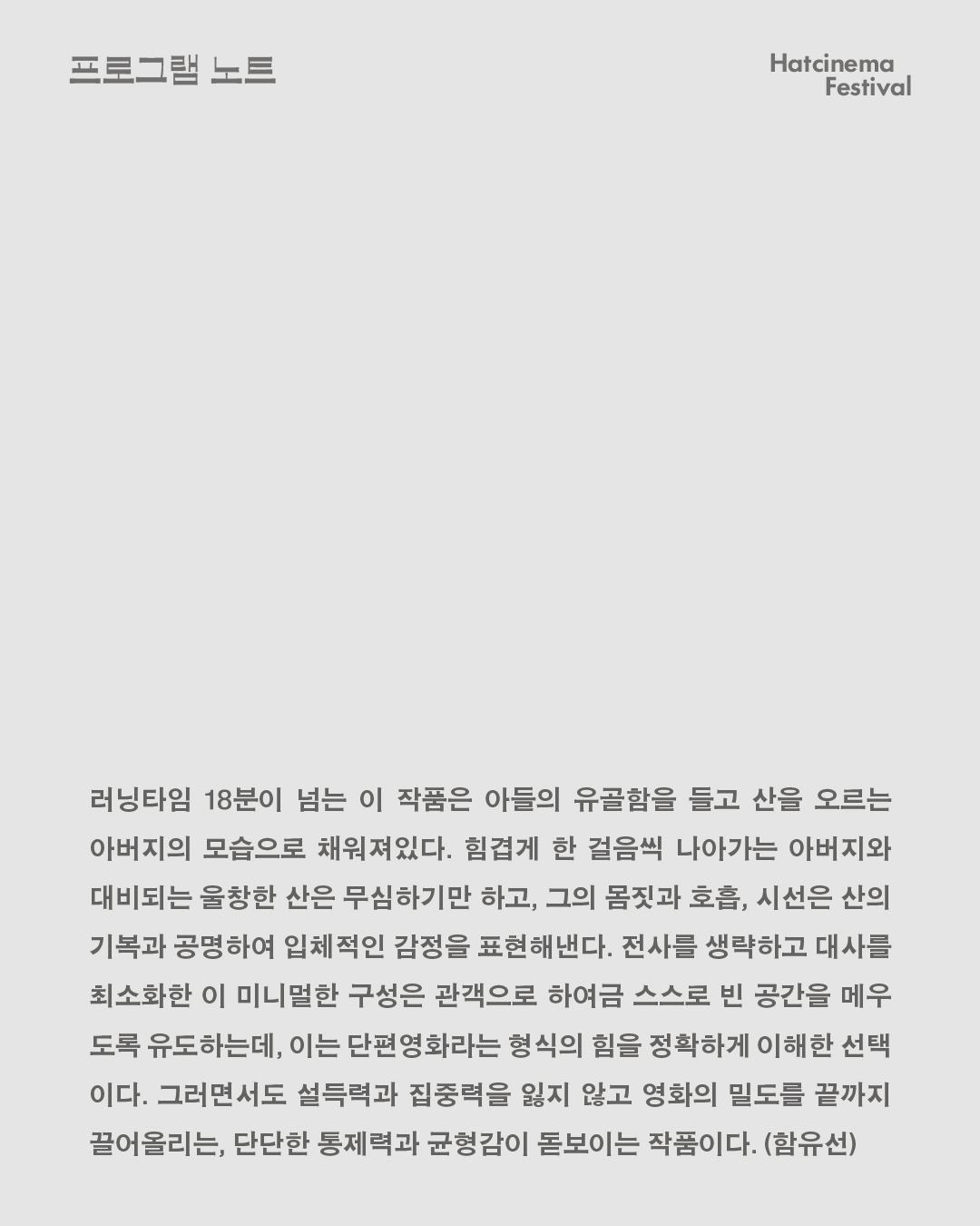 러닝타임 18분이 넘는 이 작품은 아들의 유골함을 들고 산을 오르는 아버지의 모습으로 채워져있다. 힘겹게 한 걸음씩 나아가는 아버지와 대비되는 울창한 산은 무심하기만 하고, 그의 몸짓과 호흡, 시선은 산의 기복과 공명하여 입체적인 감정을 표현해낸다. 전사를 생략하고 대사를 최소화한 이 미니멀한 구성은 관객으로 하여금 스스로 빈 공간을 메우도록 유도하는데, 이는 단편영화라는 형식의 힘을 정확하게 이해한 선택이다. 그러면서도 설득력과 집중력을 잃지 않고 영화의 밀도를 끝까지 끌어올리는, 단단한 통제력과 균형감이 돋보이는 작품이다. (춘천영화제 함유선 프로그래머)