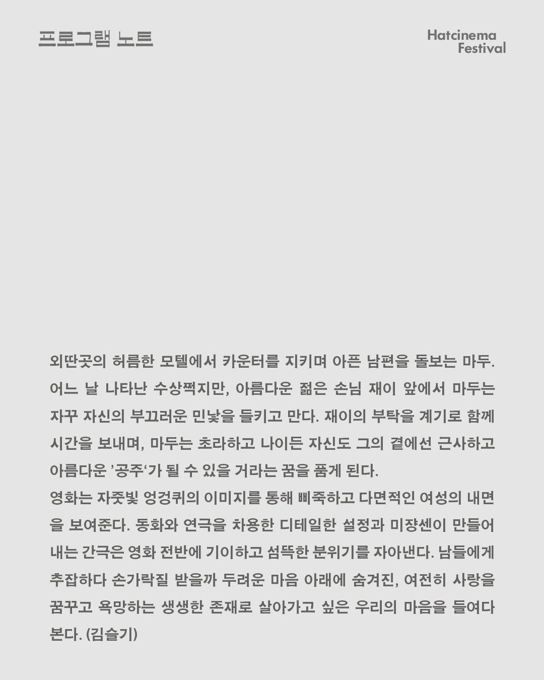 외딴곳의 허름한 모텔에서 카운터를 지키며 아픈 남편을 돌보는 마두. 어느 날 나타난 수상쩍지만, 아름다운 젊은 손님 재이 앞에서 마두는 자꾸 자신의 부끄러운 민낯을 들키고 만다. 재이의 부탁을 계기로 함께 시간을 보내며, 마두는 초라하고 나이든 자신도 그의 곁에선 근사하고 아름다운 ’공주‘가 될 수 있을 거라는 꿈을 품게 된다.