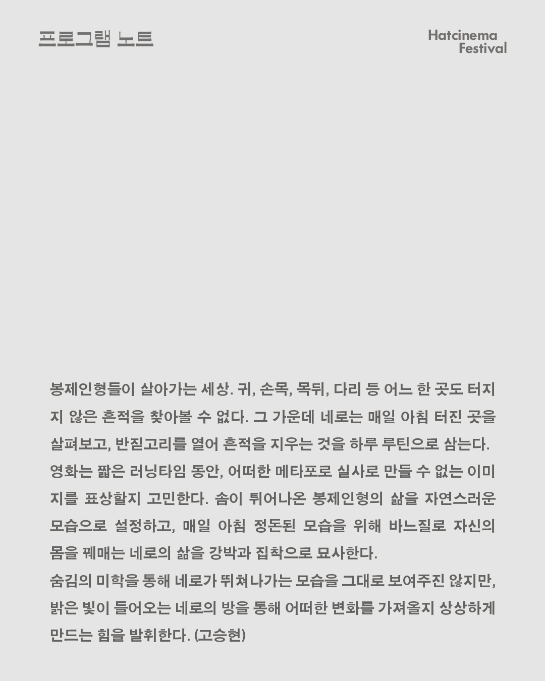 숨김의 미학을 통해 네로가 뛰쳐나가는 모습을 그대로 보여주진 않지만, 밝은 빛이 들어오는 네로의 방을 통해 어떠한 변화를 가져올지 상상하게 만드는 힘을 발휘한다. (강원독립영화협회 고승현)