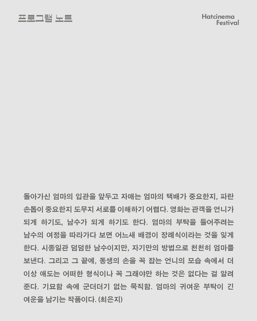 돌아가신 엄마의 입관을 앞두고 자매는 엄마의 택배가 중요한지, 파란 손톱이 중요한지 도무지 서로를 이해하기 어렵다. 영화는 관객을 언니가 되게 하기도, 남수가 되게 하기도 한다. 엄마의 부탁을 들어주려는 남수의 여정을 따라가다 보면 어느새 배경이 장례식이라는 것을 잊게 한다. 시종일관 덤덤한 남수이지만, 자기만의 방법으로 천천히 엄마를 보낸다. 그리고 그 끝에, 동생의 손을 꼭 잡는 언니의 모습 속에서 더 이상 애도는 어떠한 형식이나 꼭 그래야만 하는 것은 없다는 걸 알려준다. 기묘함 속에 군더더기 없는 묵직함. 엄마의 귀여운 부탁이 긴 여운을 남기는 작품이다. (햇시네마 페스티벌 최은지 초청팀장)