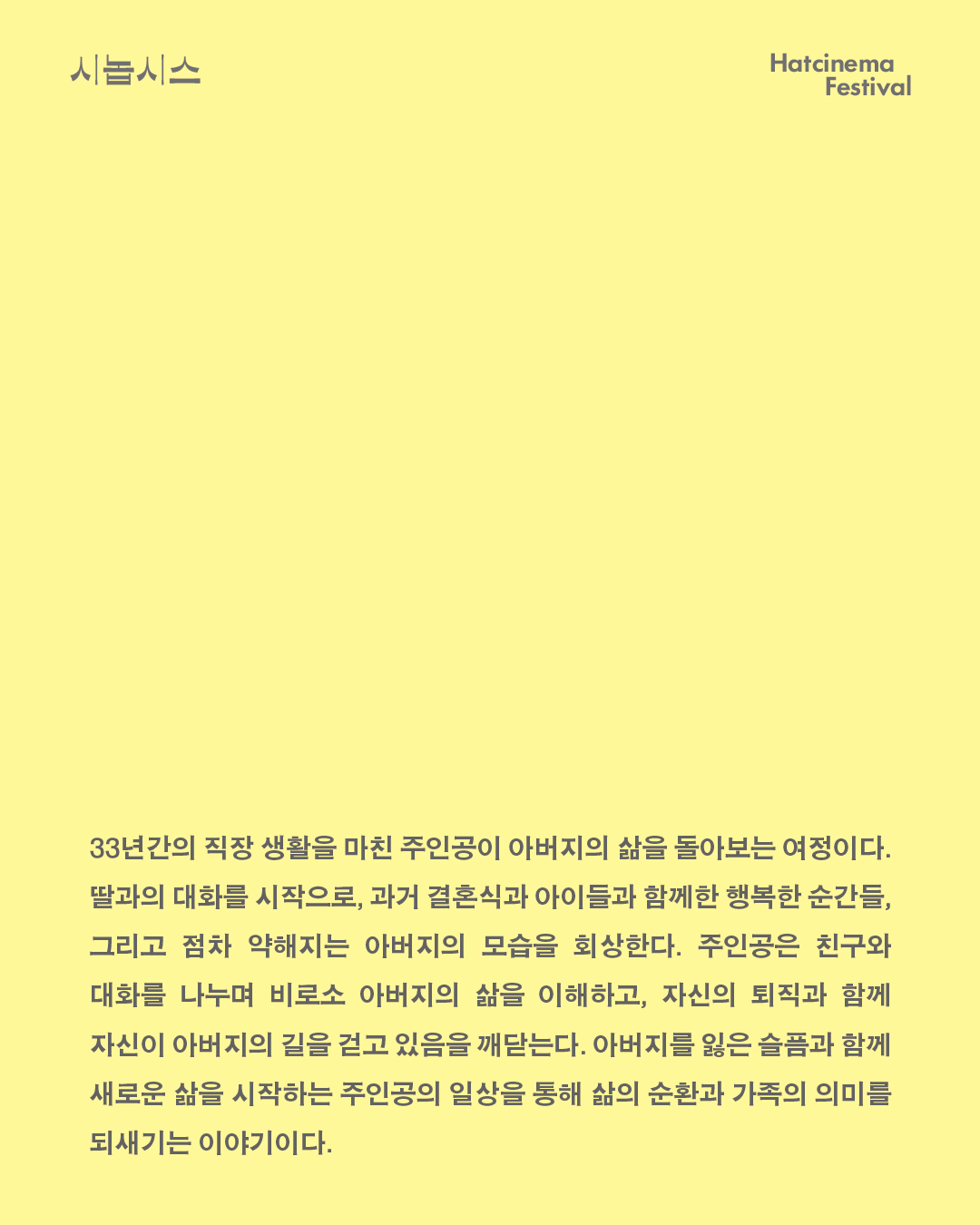 33년간의 직장 생활을 마친 주인공이 아버지의 삶을 돌아보는 여정이다. 딸과의 대화를 시작으로, 과거 결혼식과 아이들과 함께한 행복한 순간들, 그리고 점차 약해지는 아버지의 모습을 회상한다. 주인공은 친구와 대화를 나누며 비로소 아버지의 삶을 이해하고, 자신의 퇴직과 함께 자신이 아버지의 길을 걷고 있음을 깨닫는다. 아버지를 잃은 슬픔과 함께 새로운 삶을 시작하는 주인공의 일상을 통해 삶의 순환과 가족의 의미를 되새기는 이야기이다.