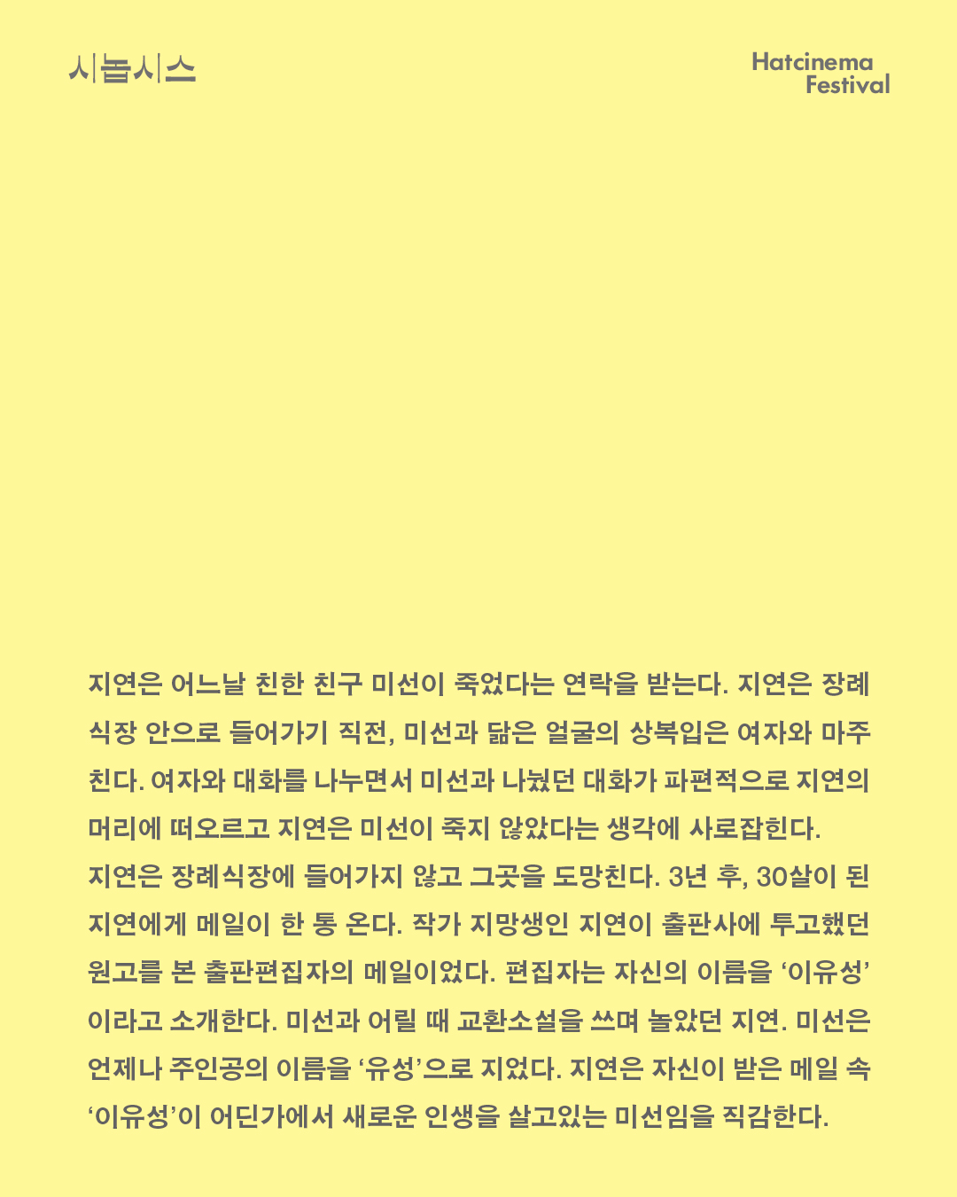지연은 어느날 친한 친구 미선이 죽었다는 연락을 받는다. 지연은 장례식장 안으로 들어가기 직전, 미선과 닮은 얼굴의 상복입은 여자와 마주친다. 여자와 대화를 나누면서 미선과 나눴던 대화가 파편적으로 지연의 머리에 떠오르고 지연은 미선이 죽지 않았다는 생각에 사로잡힌다. 지연은 장례식장에 들어가지 않고 그곳을 도망친다. 3년 후, 30살이 된 지연에게 메일이 한 통 온다. 작가 지망생인 지연이 출판사에 투고했던 원고를 본 출판편집자의 메일이었다. 편집자는 자신의 이름을 ‘이유성’이라고 소개한다. 미선과 어릴 때 교환소설을 쓰며 놀았던 지연. 미선은 언제나 주인공의 이름을 ‘유성’으로 지었다. 지연은 자신이 받은 메일 속 ‘이유성’이 어딘가에서 새로운 인생을 살고있는 미선임을 직감한다.