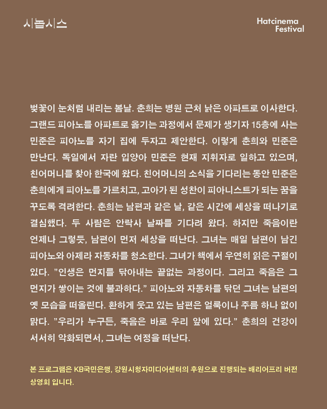벚꽃이 눈처럼 내리는 봄날. 춘희는 병원 근처 낡은 아파트로 이사한다. 그랜드 피아노를 아파트로 옮기는 과정에서 문제가 생기자 15층에 사는 민준은 피아노를 자기 집에 두자고 제안한다. 이렇게 춘희와 민준은 만난다. 독일에서 자란 입양아 민준은 현재 지휘자로 일하고 있으며, 친어머니를 찾아 한국에 왔다. 친어머니의 소식을 기다리는 동안 민준은 춘희에게 피아노를 가르치고, 고아가 된 성찬이 피아니스트가 되는 꿈을 꾸도록 격려한다. 춘희는 남편과 같은 날, 같은 시간에 세상을 떠나기로 결심했다. 두 사람은 안락사 날짜를 기다려 왔다. 하지만 죽음이란 언제나 그렇듯, 남편이 먼저 세상을 떠난다. 그녀는 매일 남편이 남긴 피아노와 아제라 자동차를 청소한다. 그녀가 책에서 우연히 읽은 구절이 있다. "인생은 먼지를 닦아내는 끝없는 과정이다. 그리고 죽음은 그 먼지가 쌓이는 것에 불과하다." 피아노와 자동차를 닦던 그녀는 남편의 옛 모습을 떠올린다. 환하게 웃고 있는 남편은 얼룩이나 주름 하나 없이 맑다. "우리가 누구든, 죽음은 바로 우리 앞에 있다." 춘희의 건강이 서서히 악화되면서, 그녀는 여정을 떠난다.
